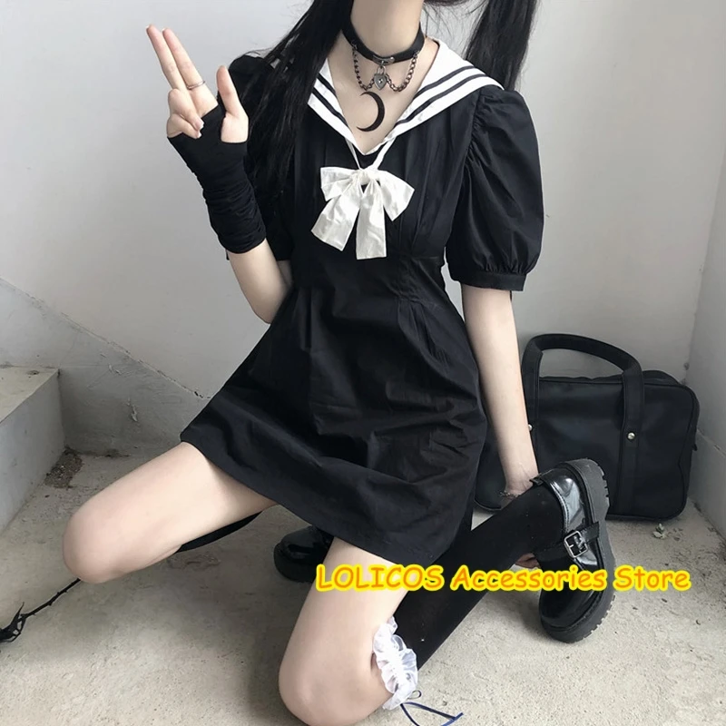 Black Navy Collar Dark Girls Mini Dress Summer 2020 New Gothic Punk College Style Korean Women's Hight Waist Short Sleeve Dress